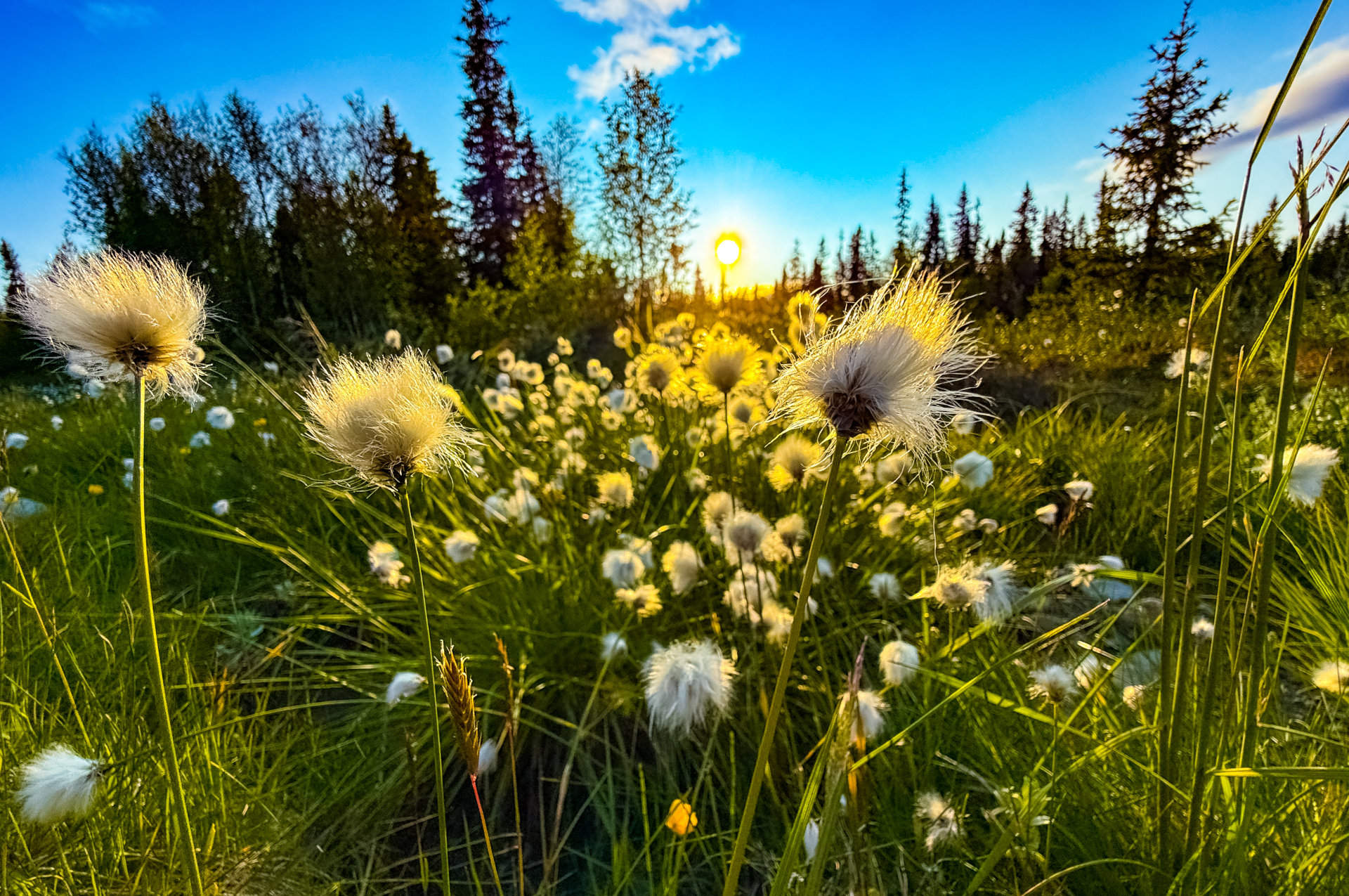 Blühendes Wollgras in den Hochmooren im Sonnenuntergang