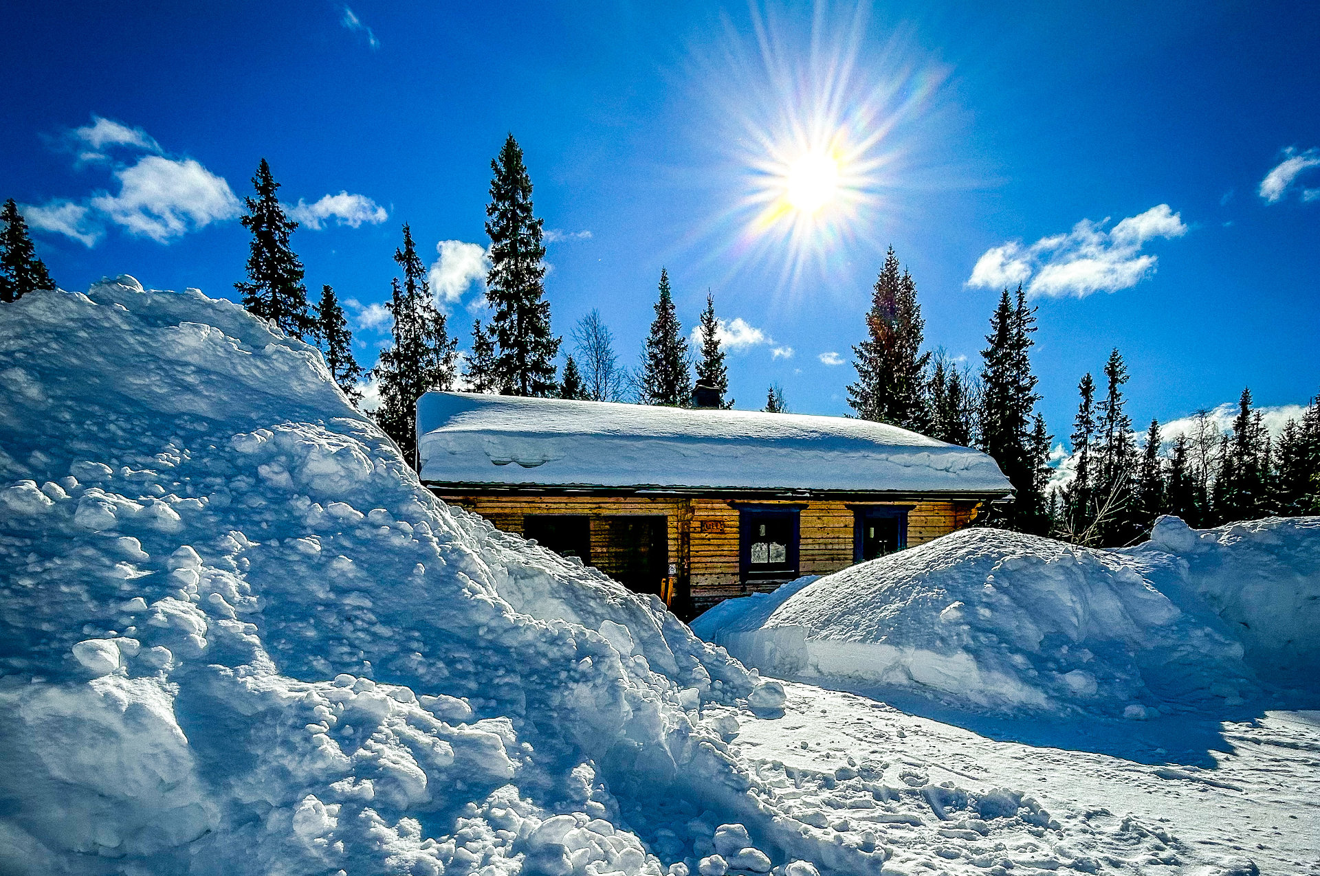 Een strakblauwe lucht bij stralende zon na de sneeuwstorm in maart. Vakantiehuis Ull in Zweden.