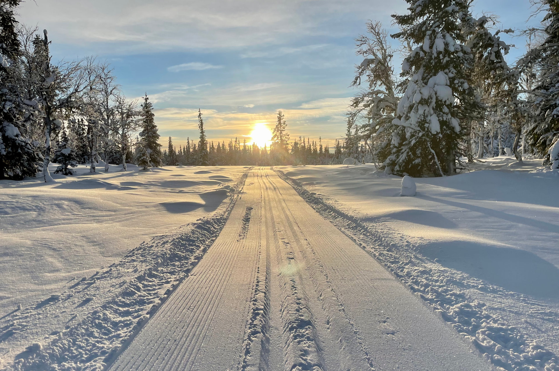 Langlaufspoor vers geprepareerd in de ochtendzon