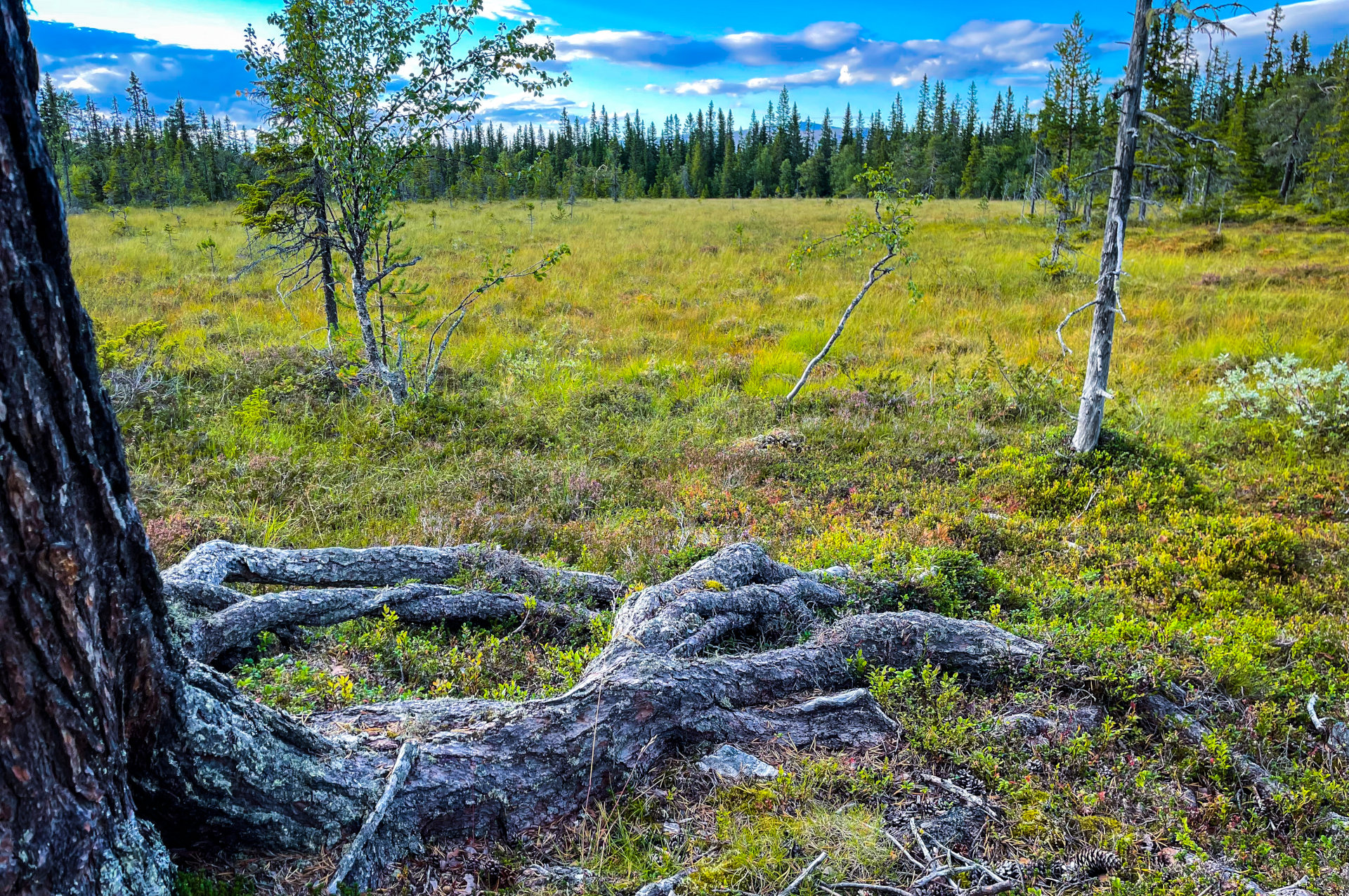 Een oude den strekt zijn wortels uit over het moeras. Op de achtergrond de Hundshögen.