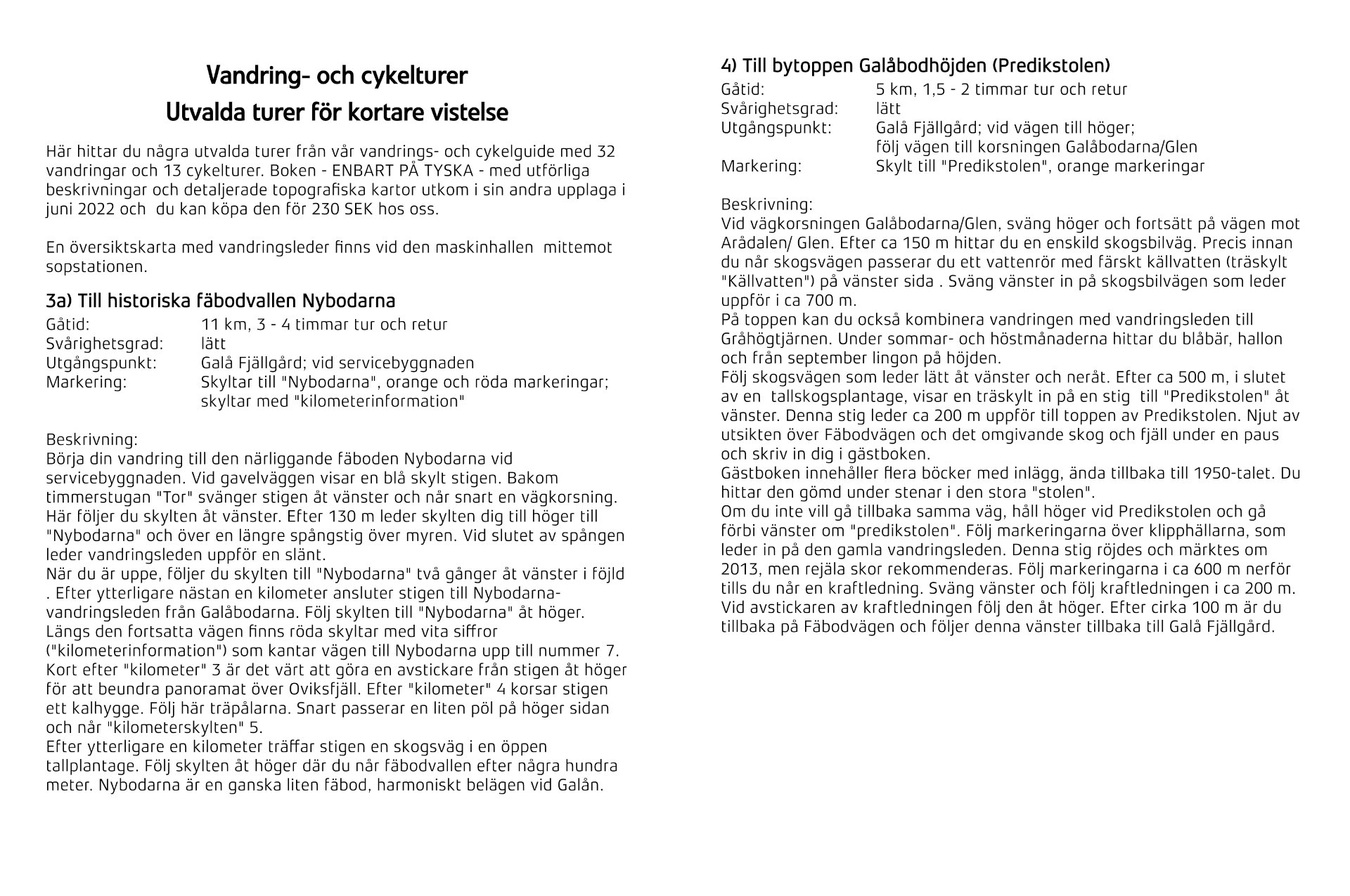 Vi är själva vandringsentusiaster och friluftsmänniskor, ofta ute i naturen och har även tagit på oss att sköta några vandringsleder i den närområdet. Dessa och många fler turer har vi beskrivit i vår vandringsguide (endast på tyska), som vi tagit fram under nästan 30 års research. För våra svenska gäster och vid en kortare vistelse, t.ex. som campinggäst, får alla gäster, oavsett om de bor i en stuga, lägenhet eller på campingen, en broschyr (på svenska) med vandringstips och beskrivningar av de populäraste turerna här på Galå Fjällgård.