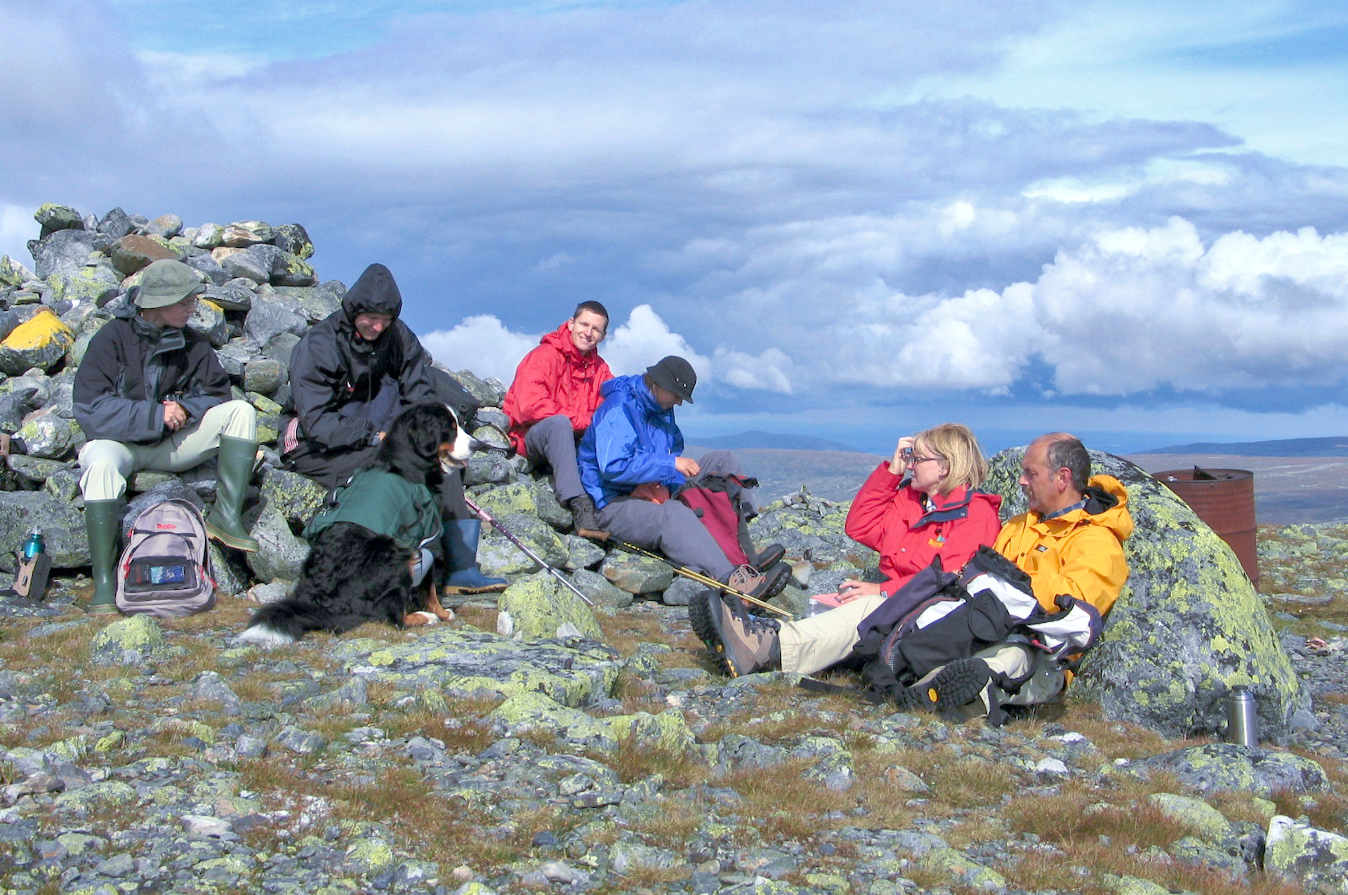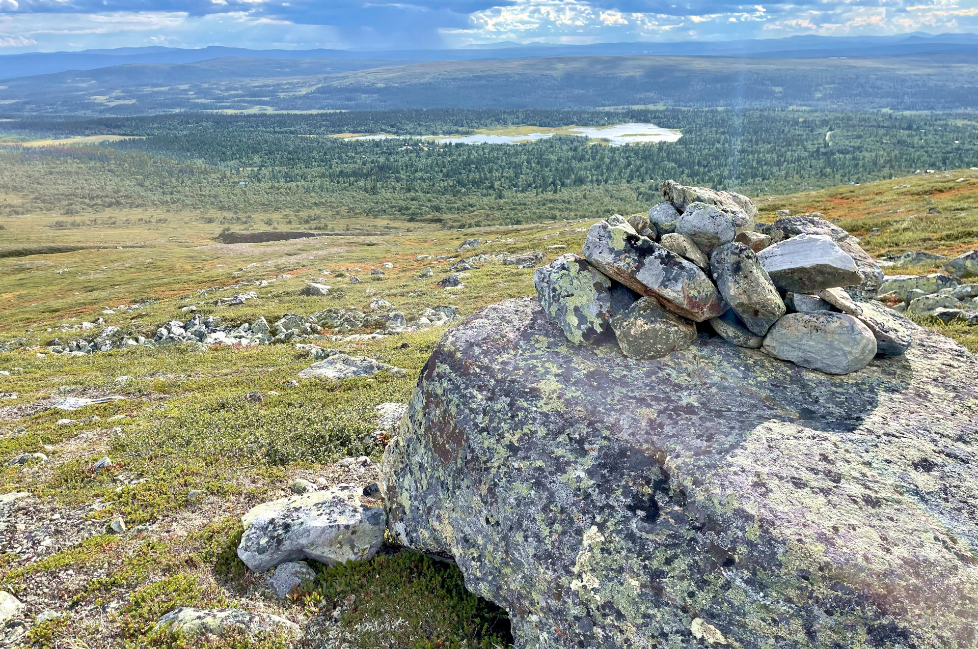 Alternativ können Sie auch den unwesentlich längeren Anstieg über den öst­lichen Gipfel des Hästryggen wählen. Dazu laufen Sie bis zum oben beschriebe­nen "Doppel-Kreuz". Biegen Sie hier nach Belieben vom Sommerweg ab und halten geradewegs auf den vor Ihnen sichtbaren Gipfel zu. Bis zum Gipfel des Hästryggen ist es ein knapper Kilometer Fußweg durch einfaches, aber weg­loses Gebiet. Ab hier haben Sie den höheren Gipfel des Hundshögen gut in Sicht. Halten Sie sich jedoch anfangs in einem 90-Grad-Winkel nach rechts, da das Gelände auf kürzestem Wege sehr geröllig ist. Nach ca. 500 m, leicht berg­ab, passieren Sie einen kleinen See. Von nun an halten Sie auf kürzestem Weg auf den Gipfel zu und erreichen diesen nach knapp 1,5 km. Zum Ausgangspunkt zurück wählen Sie entweder den gleichen Weg oder den oben beschriebenen, mit Steinpyramiden markierten Wanderweg.